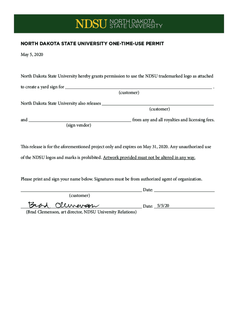 NORTH DAKOTA STATE UNIVERSITY ONETIME USE PERMIT May 5, 2020North Dakota State University hereby grants permission to use the DSU trademarked logo as attached to create a yard sign for ___.(customer)