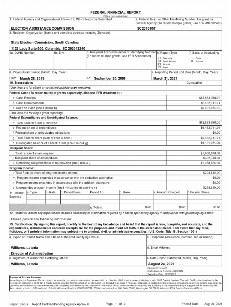 FEDERAL FINANCIAL REPORT (Follow form instructions)1. Federal Agency and Organizational Element to Which Report is SubmittedELECTION ASSISTANCE COMMISSION2. Federal Grant or Other Identifying Number