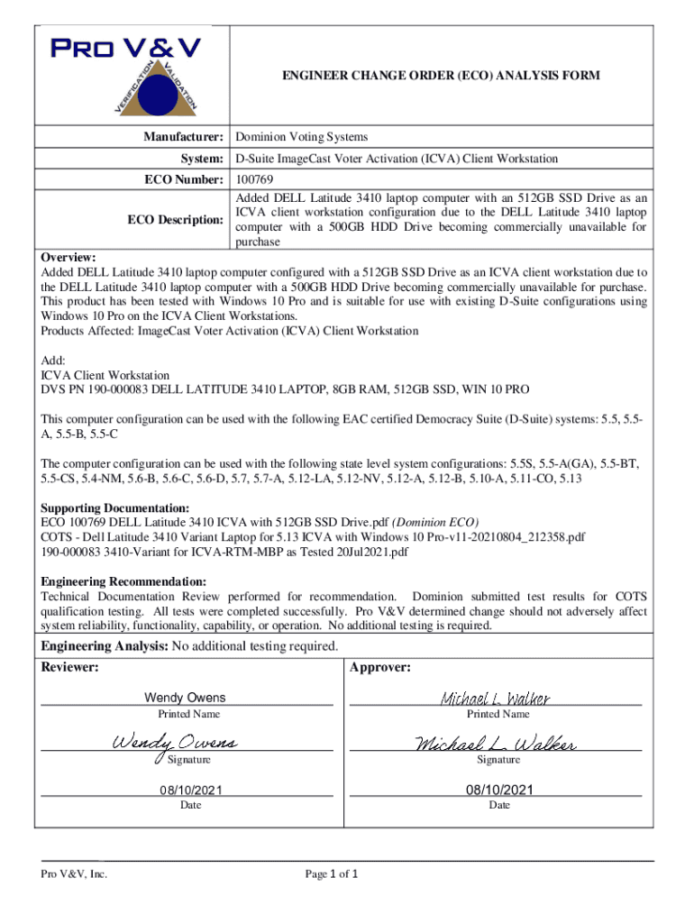 ENGINEER CHANGE ORDER (ECO) ANALYSIS Remanufacturer: Dominion Voting Systems