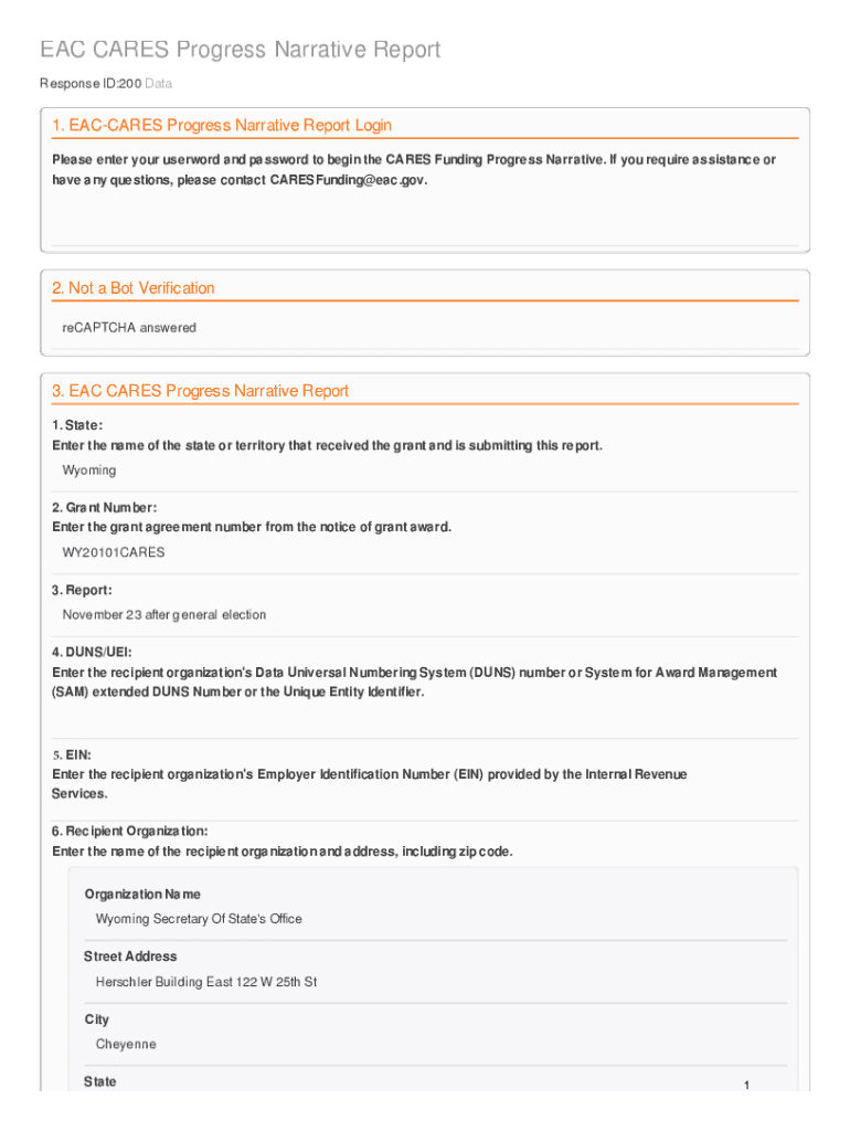 EAC CARES Progress Narrative Report Response ID:200 Data1. DAYCARES Progress Narrative Report Login Please enter your user word and password to begin the CARES Funding Progress Narrative. If you require