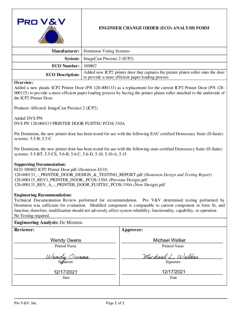 ENGINEER CHANGE ORDER (ECO) ANALYSIS Remanufacturer: Dominion Voting Systems