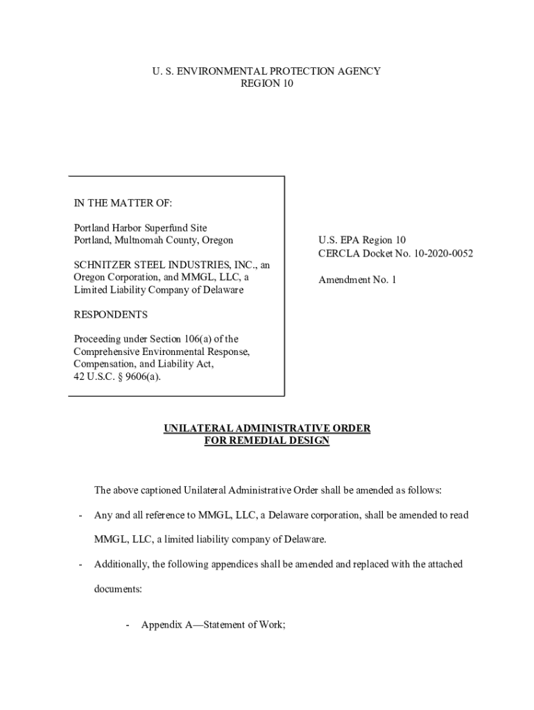 U. S. ENVIRONMENTAL PROTECTION AGENCY REGION 10IN THE MATTER OF: Portland Harbor Superfund Site Portland, Multnomah County, Oregon SCHNITZEL STEEL INDUSTRIES, INC., an Oregon Corporation, and MML,
