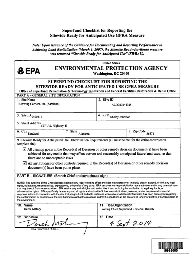Superfund Checklist for Reporting the Site wide Ready for Anticipated Use GPRA Measure Note: Upon issuance of the Guidance for Documenting and Reporting Performance in Achieving Land Revitalization