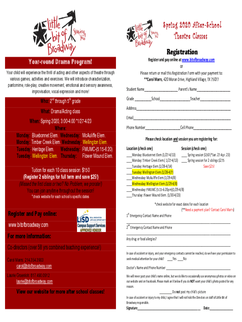 Theater ClassesRegistrationYearround Drama Program! Register and pay online at www.bitofbroadway.comYour child will experience the thrill of acting and other aspects of theater