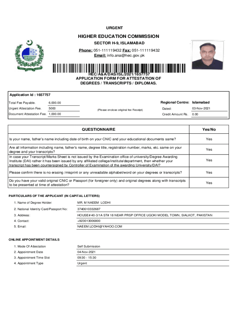URGENTHIGHER EDUCATION COMMISSION SECTOR H9, ISLAMABAD Phone: 051111119432 Fax: 051111119432 Email: info.ana@hec.gov.pkHEC/A&A/WAS/ISL/2021/1657757 APPLICATION FORM FOR ATTESTATION OF DEGREES / TRANSCRIPTS