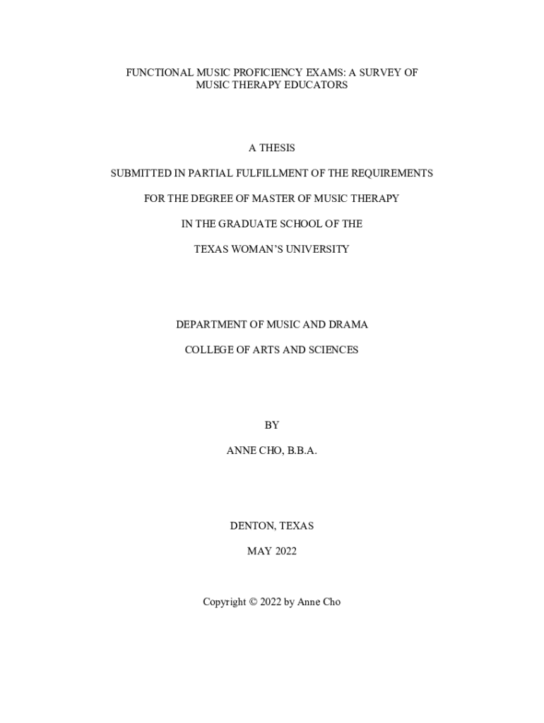 FUNCTIONAL MUSIC PROFICIENCY EXAMS: A SURVEY OF MUSIC THERAPY EDUCATORS THESIS SUBMITTED IN PARTIAL FULFILLMENT OF THE REQUIREMENTS FOR THE DEGREE OF MASTER OF MUSIC THERAPY IN THE GRADUATE SCHOOL