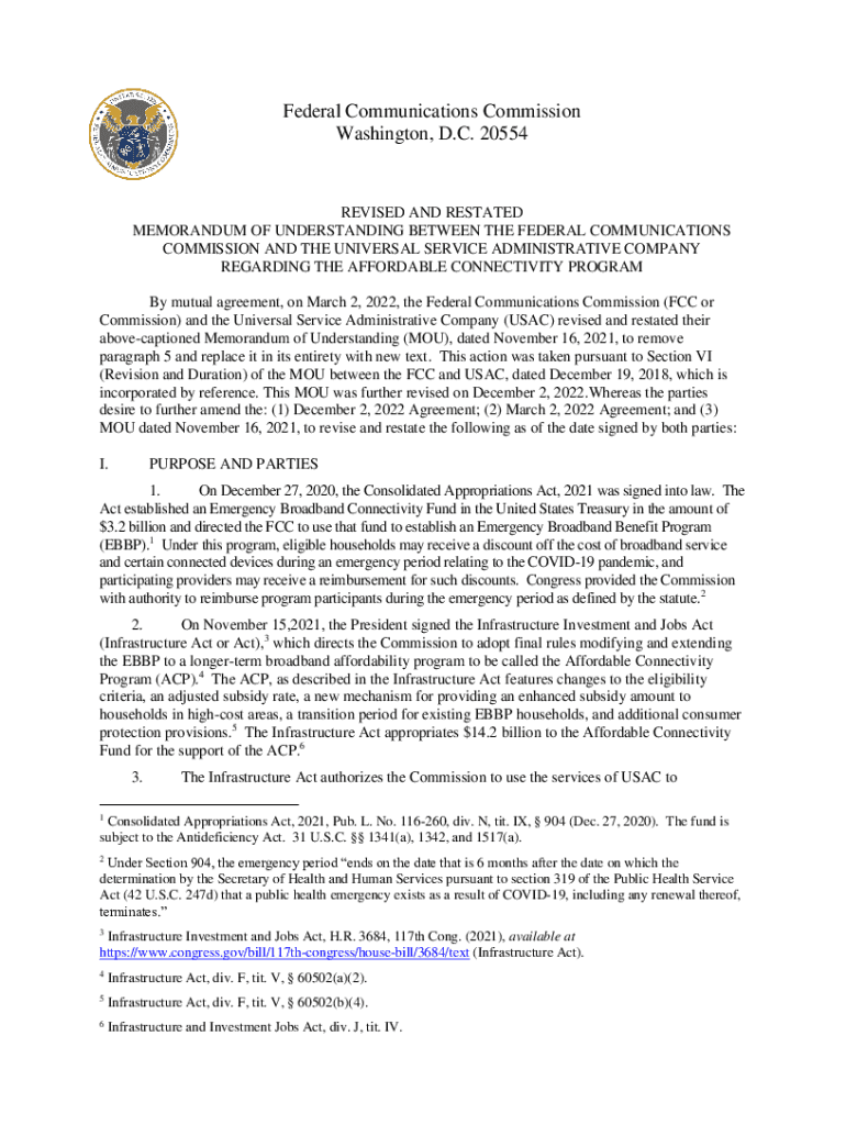 Federal Communications Commission Washington, D.C. 20554REVISED AND RESTATED MEMORANDUM OF UNDERSTANDING BETWEEN THE FEDERAL COMMUNICATIONS COMMISSION AND THE UNIVERSAL SERVICE ADMINISTRATIVE COMPANY