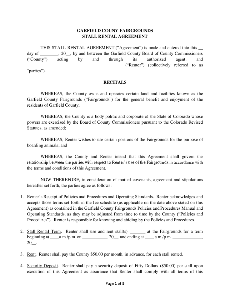GARFIELD COUNTY FAIRGROUNDS STALL RENTAL AGREEMENT THIS STALL RENTAL AGREEMENT (Agreement) is made and entered into this __ day of ___, 20__, by and between the Garfield County Board of County Commissioners