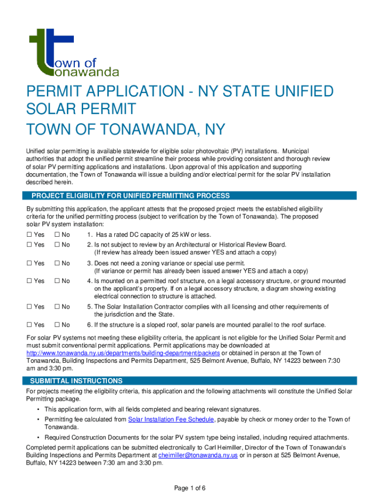 PERMIT APPLICATION NY STATE UNIFIED SOLAR PERMIT TOWN OF LAWANDA, NY Unified solar permitting is available statewide for eligible solar photovoltaic (PV) installations. Municipal authorities that