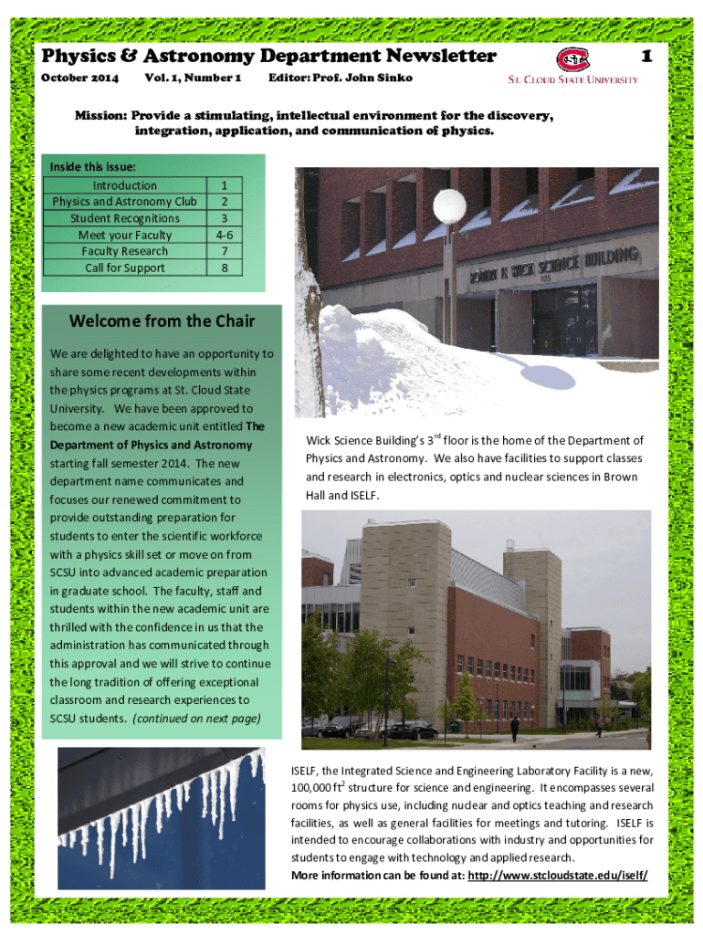 Physics & Astronomy Department Newsletter October 2014Vol. 1, Number 11Editor: Prof. John SinkoMission: Provide a stimulating, intellectual environment for the discovery, integration, application,