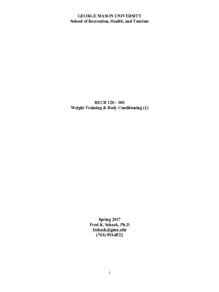 GEORGE MASON UNIVERSITY School of Recreation, Health, and TourismRECR 120 001 Weight Training & Body Conditioning (1)Spring 2017 Fred K. Shack, Ph.D. fschack@gmu.edu (703) 99385221TABLE OF CONTENTS