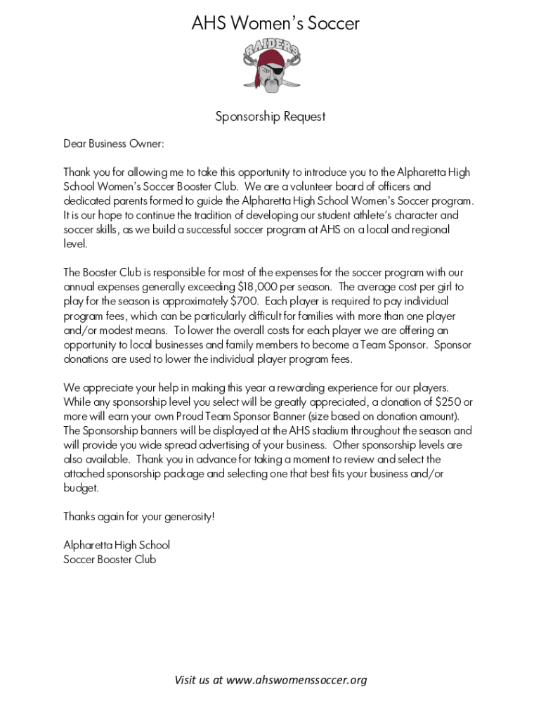 AHS Women's SoccerSponsorship Request Dear Business Owner: Thank you for allowing me to take this opportunity to introduce you to the Alpharetta High School Women's Soccer Booster Club. We are a volunteer