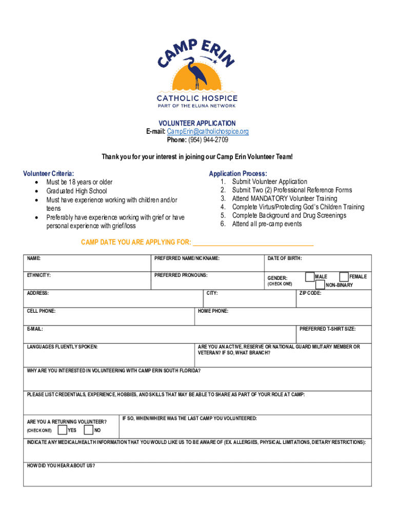 VOLUNTEER APPLICATION Email: CampErin@catholichospice.org Phone: (954) 9442709 Thank you for your interest in joining our Camp Erin Volunteer Team! Volunteer Criteria: Must be 18 years or older Graduated