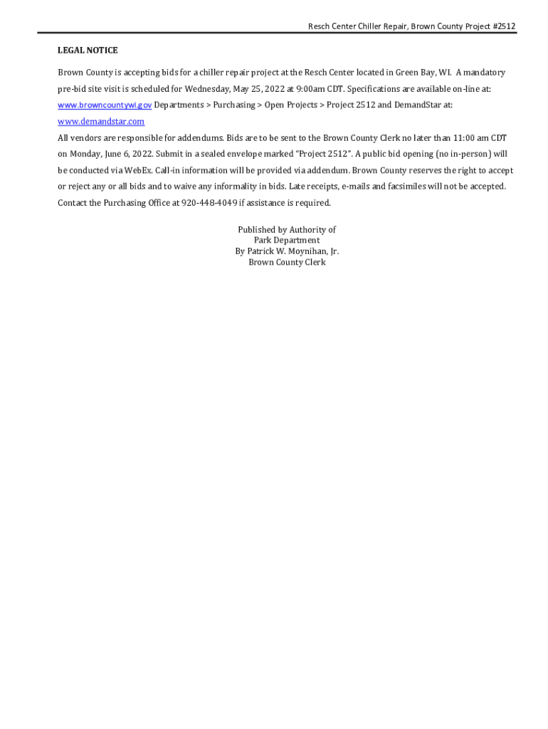 Reach Center Chiller Repair, Brown County Project #2512 LEGAL NOTICE Brown County is accepting bids for a chiller repair project at the Reach Center located in Green Bay, WI. A mandatory prebid site