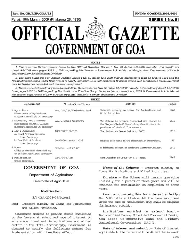Reg. No. GR/RNA/GOA/32RNI No. GOING/2002/6410Panaji, 19th March 2009 (Phalanx 28, 1930)SERIES I No. 51NOTES 1. There is one Extraordinary issue to the Official Gazette, Series I No. 49 dated 532009