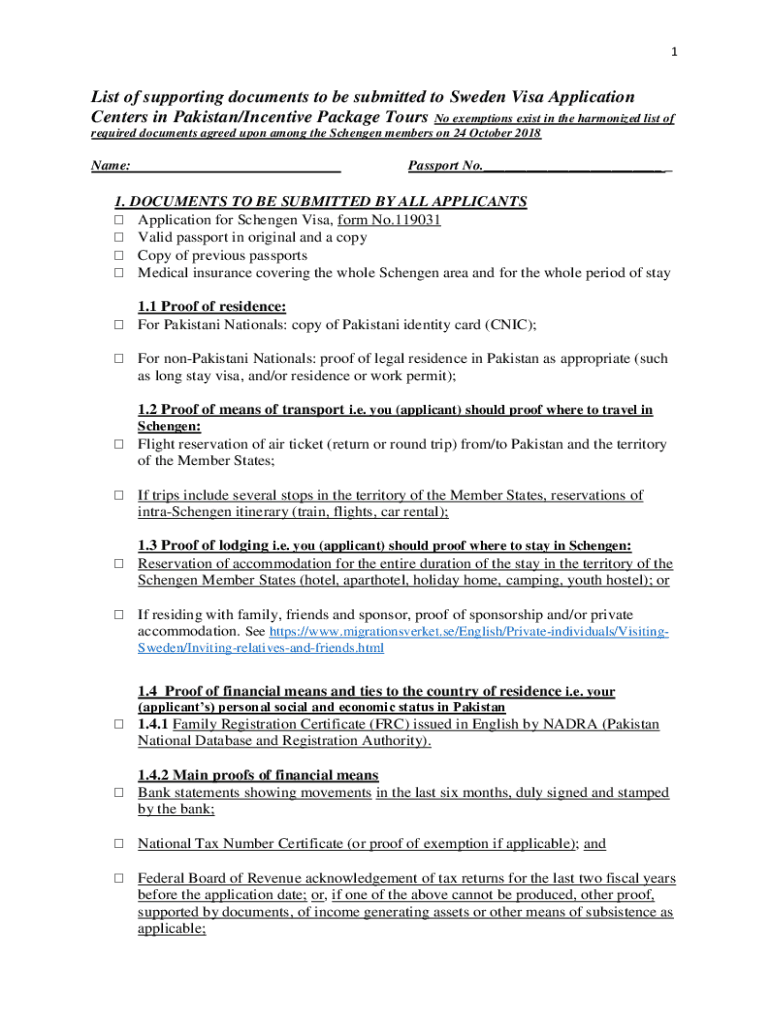1List of supporting documents to be submitted to Sweden Visa Application Centers in Pakistan/Incentive Package Tours No exemptions exist in the harmonized list of required documents agreed upon among