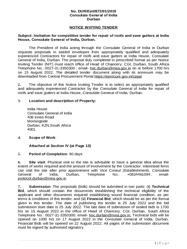 No. Do/EST/872/01/2019 Consulate General of India Durban NOTICE INVITING TENDER Subject: Invitation for competitive tender for repair of roofs and eave gutters at India House, Consulate General of