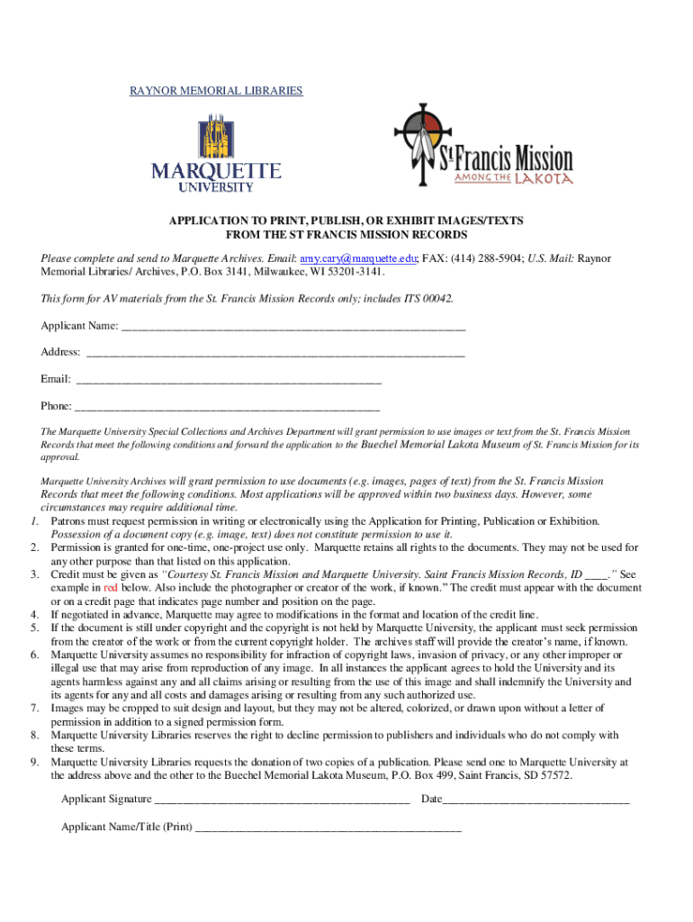RAY NOR MEMORIAL LIBRARIESAPPLICATION TO PRINT, PUBLISH, OR EXHIBIT IMAGES/TEXTS FROM THE ST FRANCIS MISSION RECORDS Please complete and send to Marquette Archives. Email: amy.cary@marquette.edu;