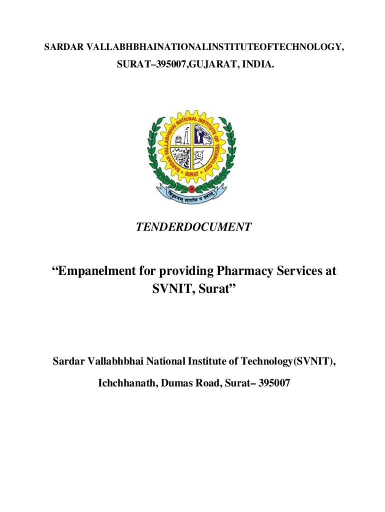SA RDAR VALLABHBHAINATIONALINSTITUTEOFTECHNOLOGY,SURAT395007,GUJARAT, INDIA.TENDERDOCUMENTEmpanelment for providing Pharmacy Services at