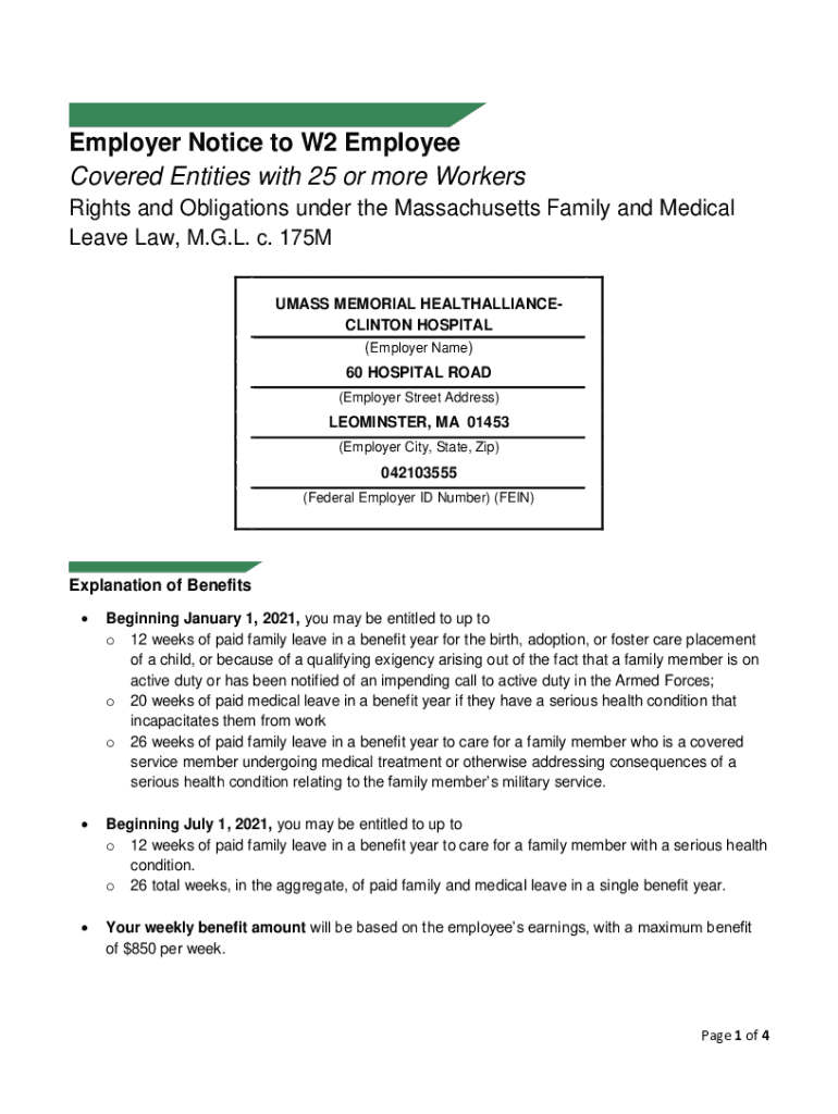 Employer Notice to W2 Employee Covered Entities with 25 or more Workers Rights and Obligations under the Massachusetts Family and Medical Leave Law, M.G.L. c. 175M MASS MEMORIAL HEALTHALLIANCECLINTON