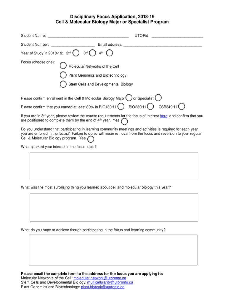Disciplinary Focus Application, 201819 Cell & Molecular Biology Major or Specialist Program Student Name: ___Stored: ___Student Number: ___ Email address: ___ Year of Study in 201819: 2nd3rd4thFocus