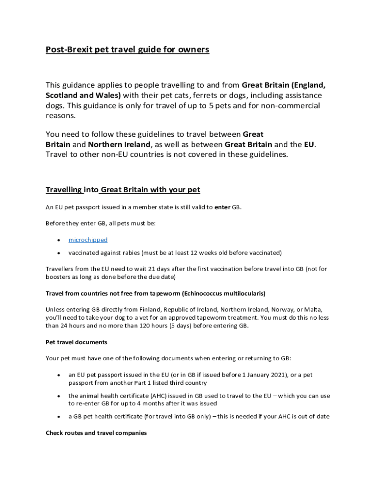 PostBrexit pet travel guide for ownership guidance applies to people travelling to and from Great Britain (England, Scotland and Wales) with their pet cats, ferrets or dogs, including assistance dogs.