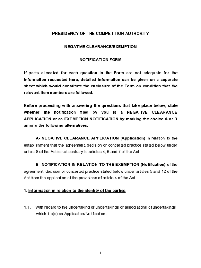 PRESIDENCY OF THE COMPETITION AUTHORITYNEGATIVE CLEARANCE/EXEMPTIONNOTIFICATION FORM If parts allocated for each question in the Form are not adequate for the information requested here, detailed