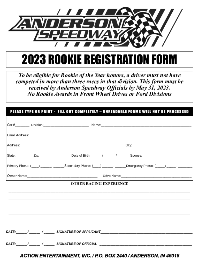 2023 ROOKIE REGISTRATION FORM To be eligible for Rookie of the Year honors, a driver must not have competed in more than three races in that division. This form must be received by Anderson Speedway