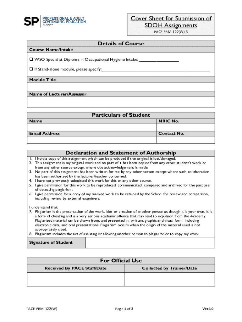 Cover Sheet for Submission of SDH Assignments PACEFRM122(W)3Details of Course Name/Intake WSU Specialist Diploma in Occupational Hygiene Intake: ___ If Standalone module, please specify:___ Module