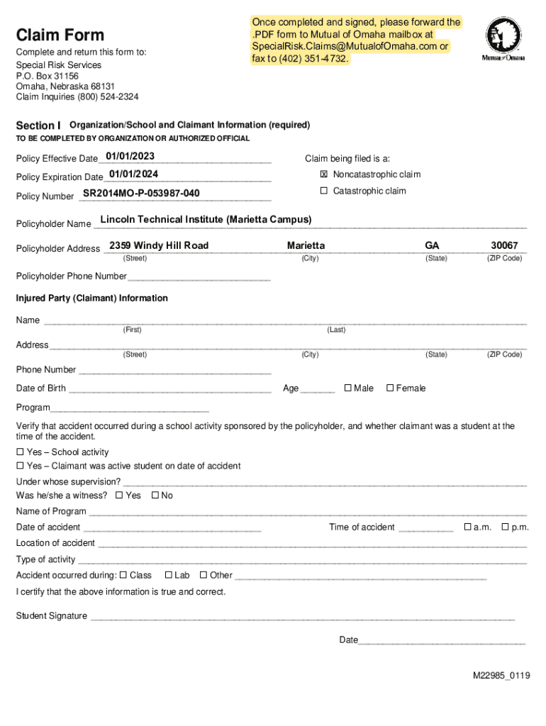 Once completed and signed, please forward the .PDF form to Mutual of Omaha mailbox at SpecialRisk.Claims@MutualofOmaha.com or fax to (402) 3514732. Claim Form Complete and return this form to: Special