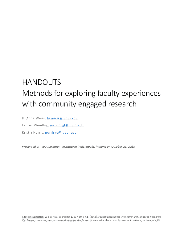 HANDOUTS Methods for exploring faculty experiences with community engaged research H. Anne Weiss, haweiss@iupui.edu Lauren Wending, wendlingl@iupui.edu Kristin Norris, norriske@iupui.eduPresented