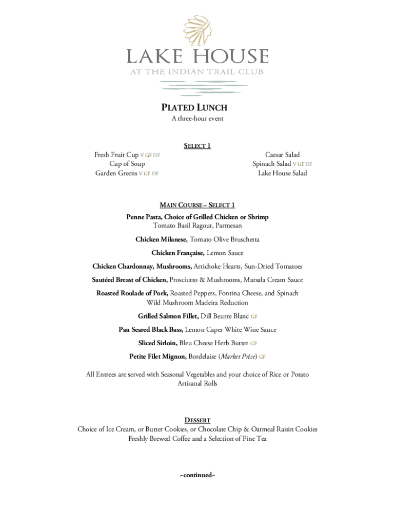 PLATED LUNCH A three-hour oven-fresh Fruit Cup V GF OF Cup of Soup Garden Greens V GF DESELECT 1Caesar Salad Spinach Salad V GF OF Lake House Saladin COURSE SELECT 1 Penne Pasta, Choice of Grilled