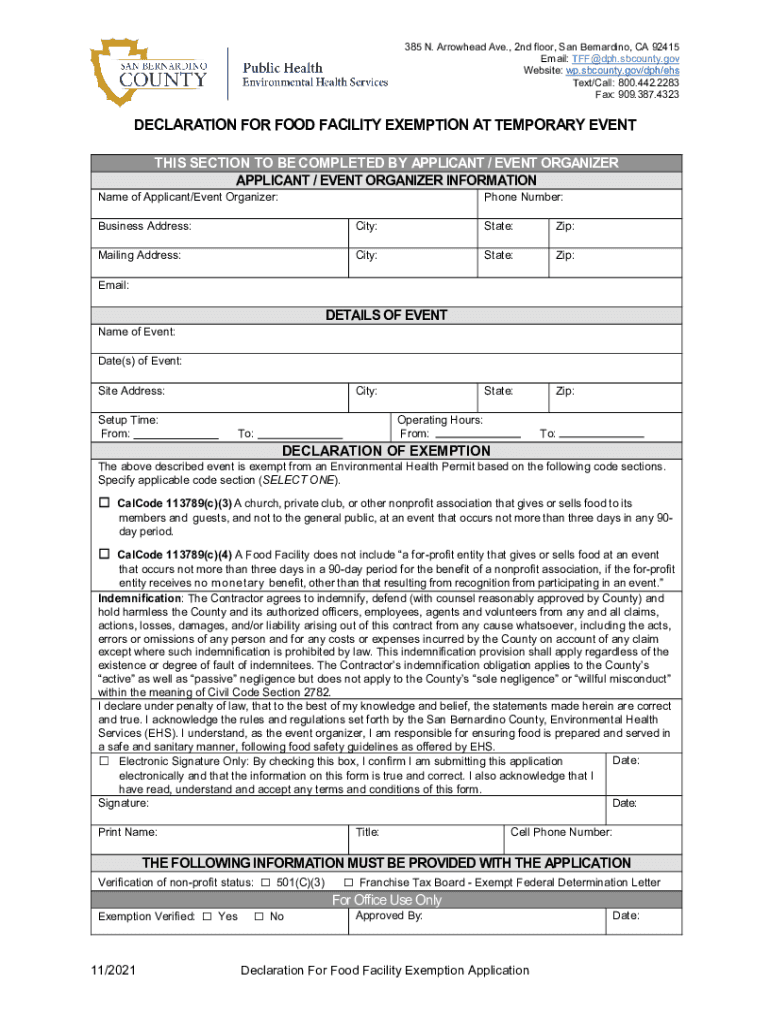 385 N. Arrowhead Ave., 2nd floor, San Bernardino, CA 92415 Email: TFF@dph.sbcounty.gov Website: wp.sbcounty.gov/dph/ehs Text/Call: 800.442.2283 Fax: 909.387.4323DECLARATION FOR FOOD FACILITY EXEMPTION