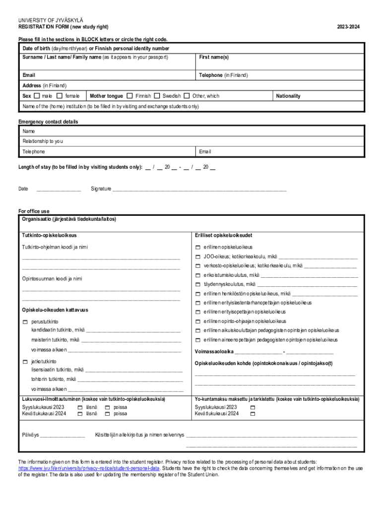 UNIVERSITY OF JYVÄSKYLÄ REGISTRATION FORM (new study right)20232024Please fill in the sections in BLOCK letters or circle the right code. Date of birth (day/month/year) or Finnish personal identity