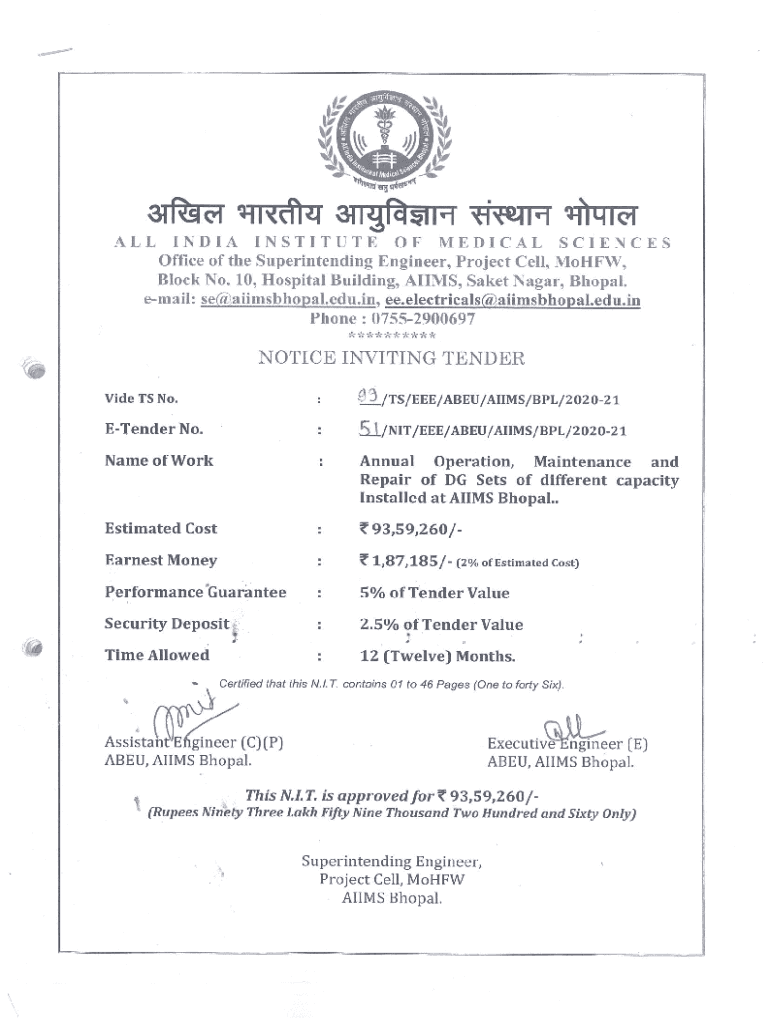 Get the free Annual Operation, Maintenance and Repair of DG Sets of different - aiimsbhopal edu