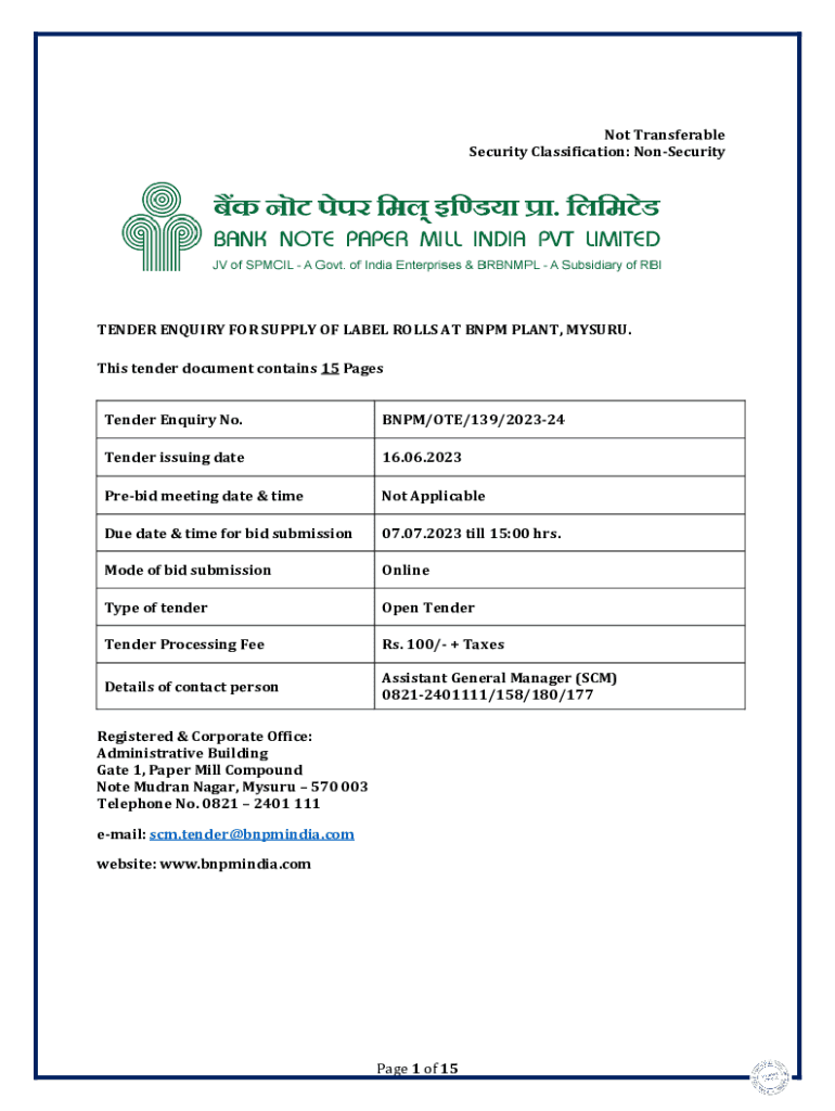 Tender Inquiry No.BNPM/OTE/139/202324Tender