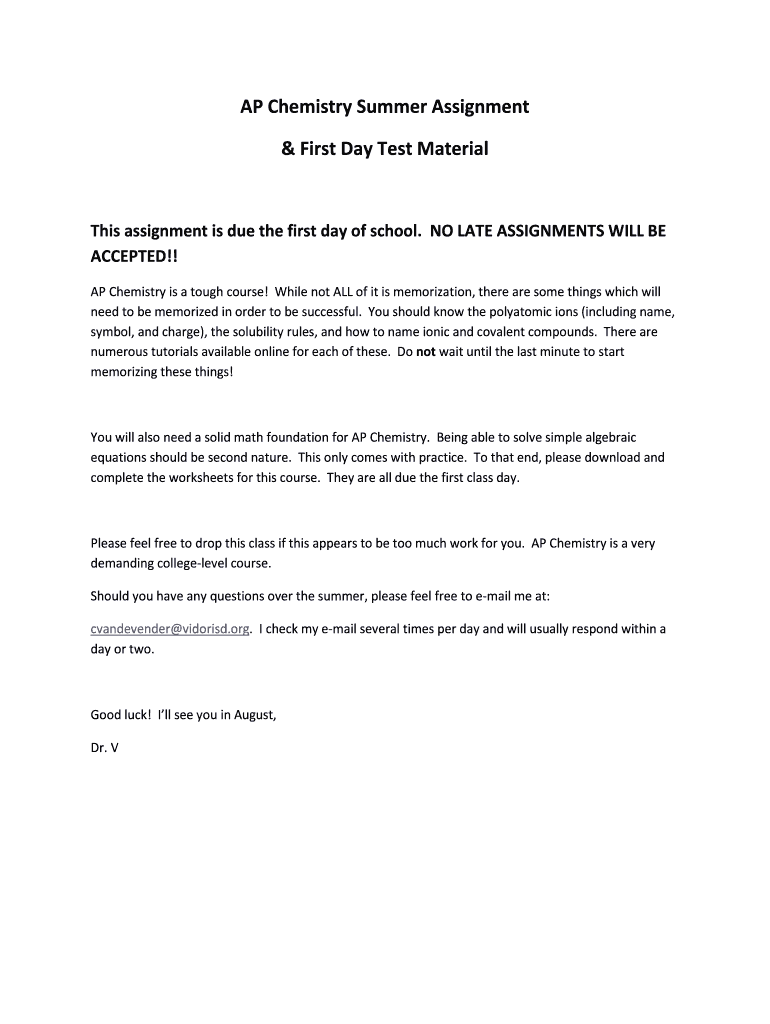 Get the free AP Chemistry Summer Assignment amp First Day Test Material - vidorisd