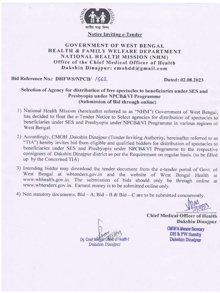 Finn RR freq Notice Inviting eTenderGOVERNMENT OT WEST BENGAL HEALTH & FAMILY WELFARE. E DEPARTMENT NATIONAL HEALTH MISSION (NHS) Office of the Chief Medical Officer of Health Dashing Dimapur: cmohdd@gmail.com