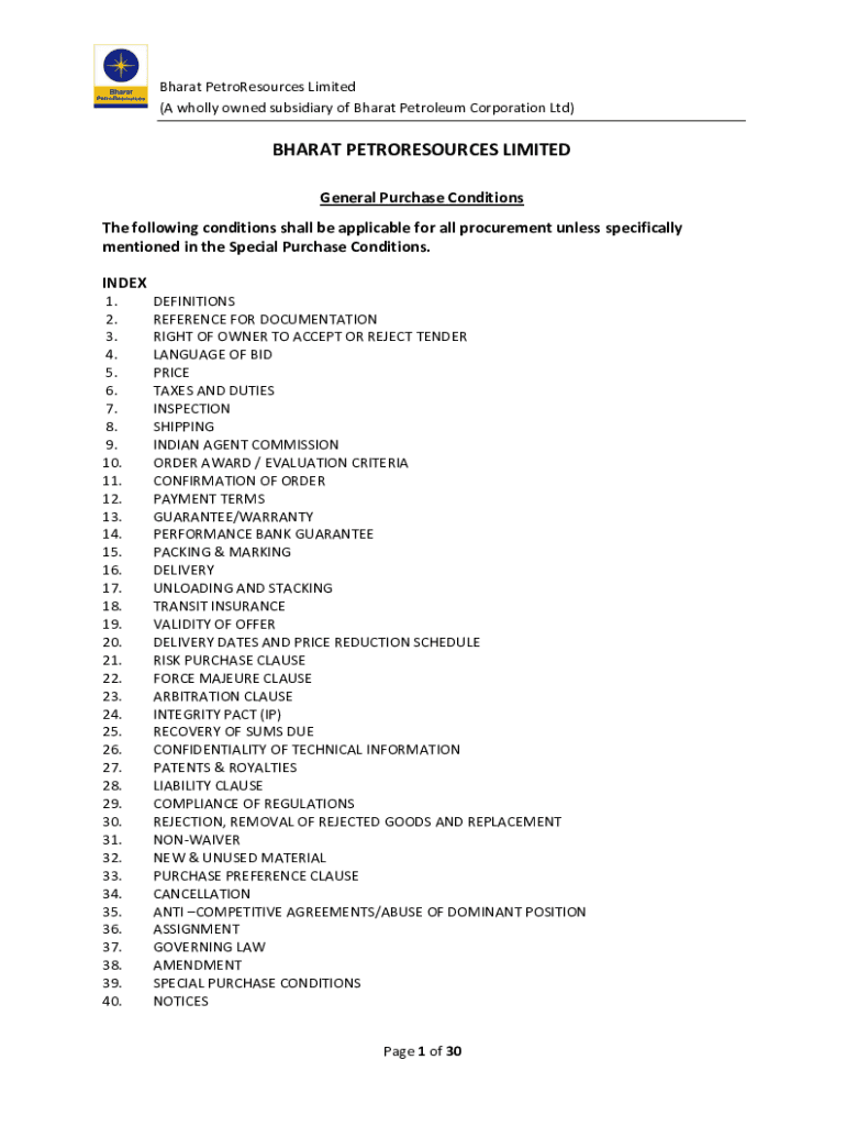 Bharat PetroResources Limited (A wholly owned subsidiary of Bharat Petroleum Corporation Ltd)BHARAT PETRORESOURCES LIMITED General Purchase Conditions The following conditions shall be applicable
