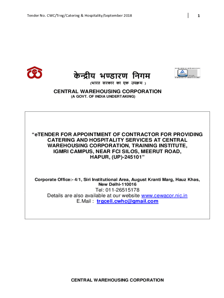 Tender No. CWC/Tang/Catering & Hospitality/September 20181 ()CENTRAL WAREHOUSING CORPORATION (A GOVT. OF INDIA UNDERTAKING)tender FOR APPOINTMENT OF CONTRACTOR FOR PROVIDING CATERING AND HOSPITALITY