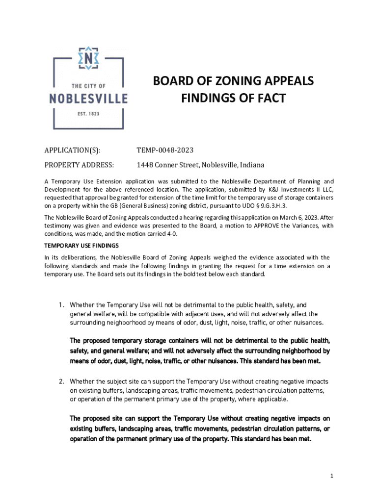 BOARD OF ZONING APPEALS FINDINGS OF FACTAPPLICATION(S):TEMP00482023PROPERTY ADDRESS:1448 Conner Street, Noblesville, Indiana Temporary Use Extension application was submitted to the Noblesville Department