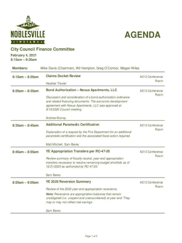 AGENDA City Council Finance Committee February 4, 2021 8:15am 9:30am Members: 8:15am 8:20amMike Davis (Chairman), Will Hampton, Greg O'Connor, Megan Wiles Claims Docket ReviewA213 Conference Room