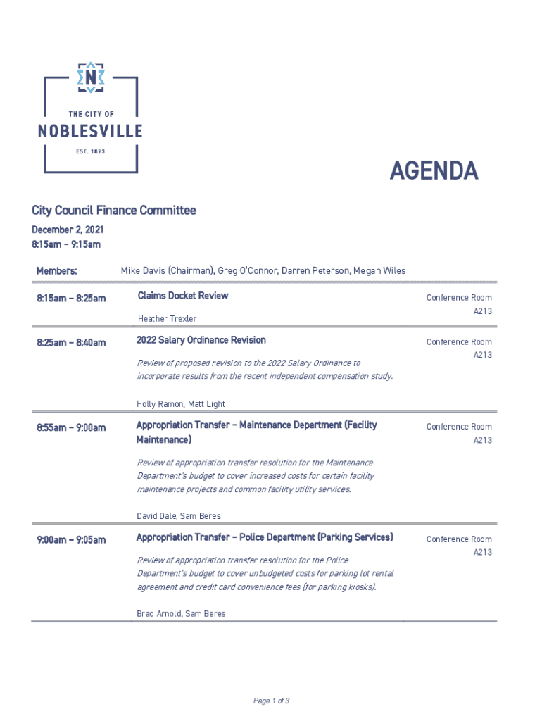 AGENDA City Council Finance Committee December 2, 2021 8:15am 9:15am Members: 8:15am 8:25amMike Davis (Chairman), Greg O'Connor, Darren Peterson, Megan Wiles Claims Docket ReviewConference Room A213Heather