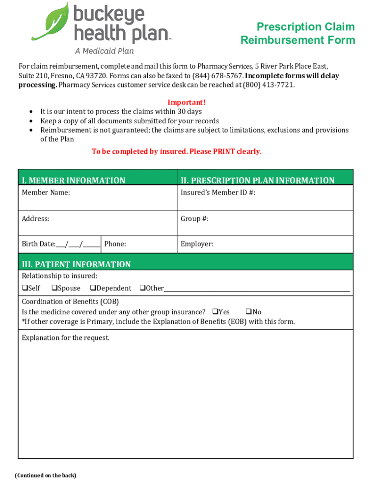 Prescription Claim Reimbursement Form For claim reimbursement, complete and mail this form to Pharmacy Services, 5 River Park Place East, Suite 210, Fresno, CA 93720. Forms can also be faxed to (844)