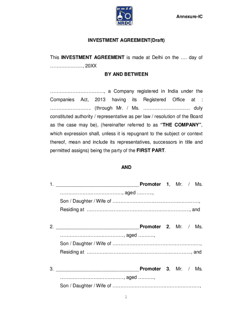 AAnnexureICINVESTMENT AGREEMENT(Draft)This INVESTMENT AGREEMENT is made at Delhi on the . Day of .........., 20XX BY AND BETWEEN., a Company registered in India under the Companies,2013havingitsRegisteredOfficeat:.