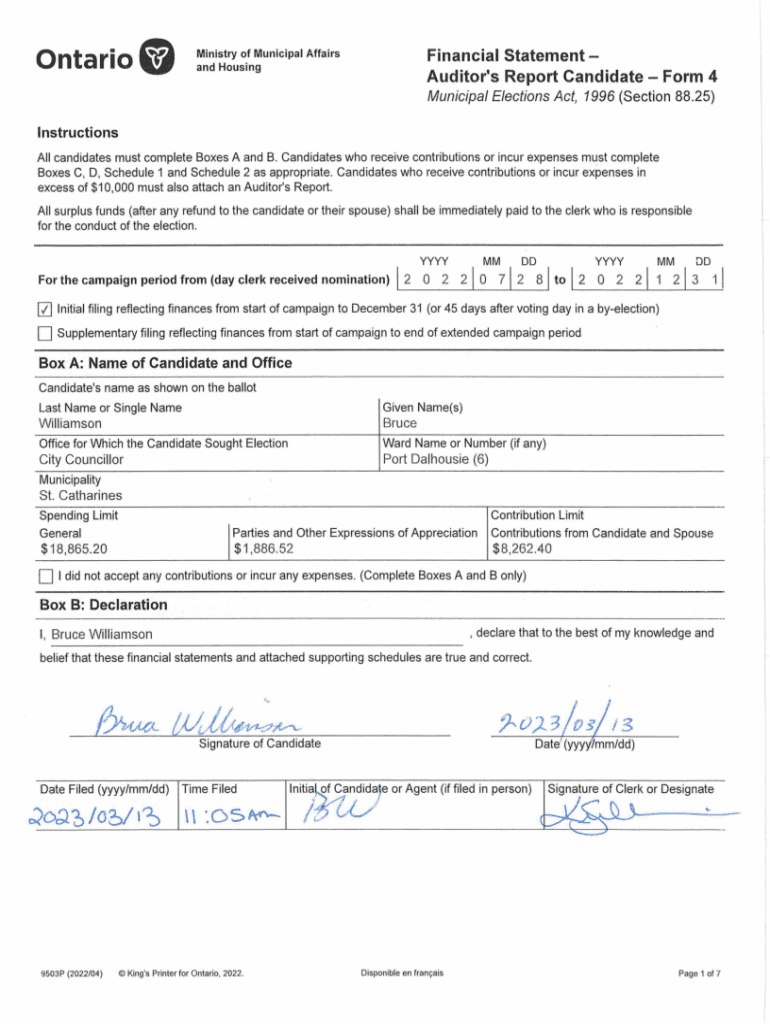 Ontario 0Ministry of Municipal Affairs and HousingFinancial StatementAuditor\'s Report Candidate Form 4 Municipal Elections Act, 1996 (Section 88.25)Instructions All candidates must complete Boxes