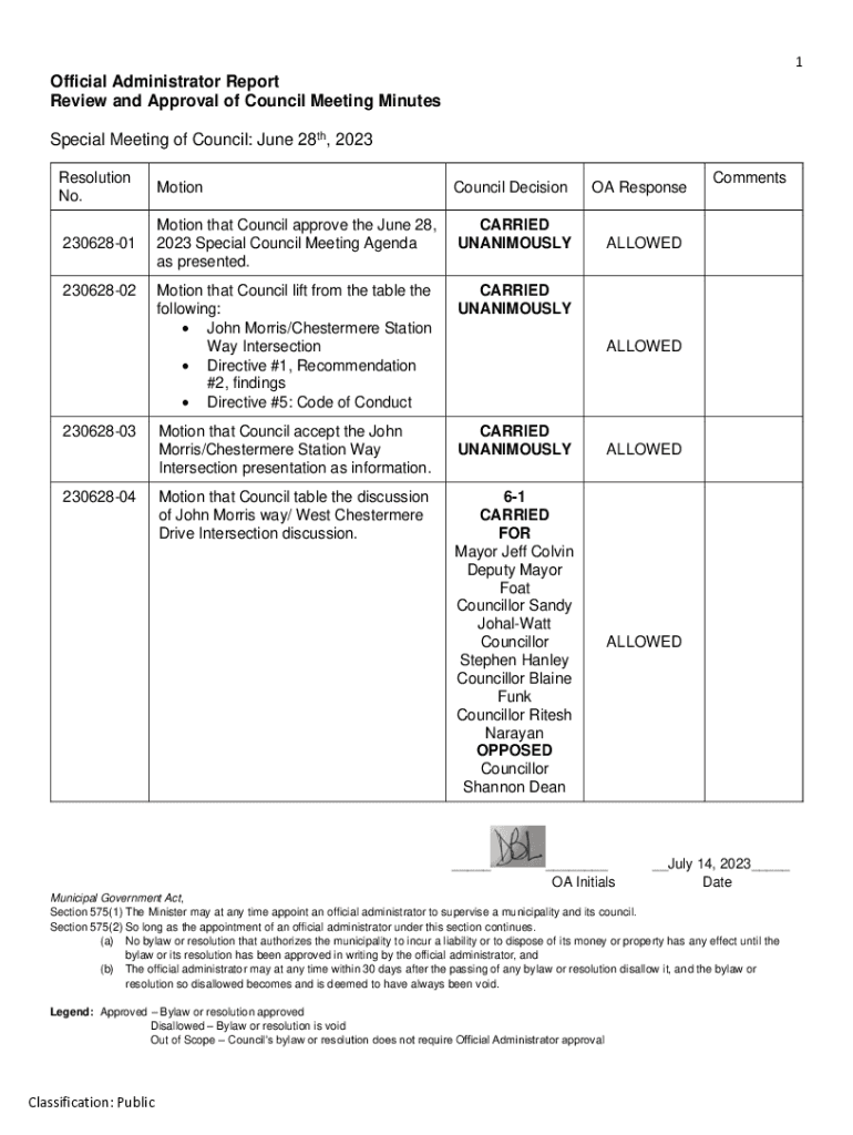 1Official Administrator Report Review and Approval of Council Meeting Minutes Special Meeting of Council: June 28th, 2023 Resolution No. MotionCouncil Decision23062801Motion that Council approves