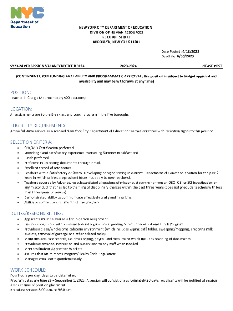 NEW YORK CITY DEPARTMENT OF EDUCATION DIVISION OF HUMAN RESOURCES 65 COURT STREET BROOKLYN, NEW YORK 11201 Date Posted: 4/18/2023 Deadline: 6/30/2023 SY2324 PER SESSION VACANCY NOTICE # 012420232024PLEASE