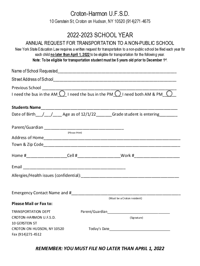 ANNUAL REQUEST FOR TRANSPORTATION TO A NONPUBLIC SCHOOL