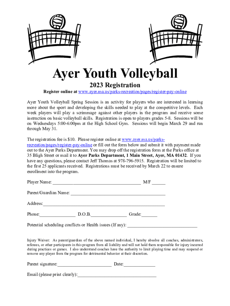 Layer Youth Volleyball 2023 RegistrationRegister online at www.ayer.ma.us/parksrecreation/pages/registerpayonline Layer Youth Volleyball Spring Session is an activity for players who are interested
